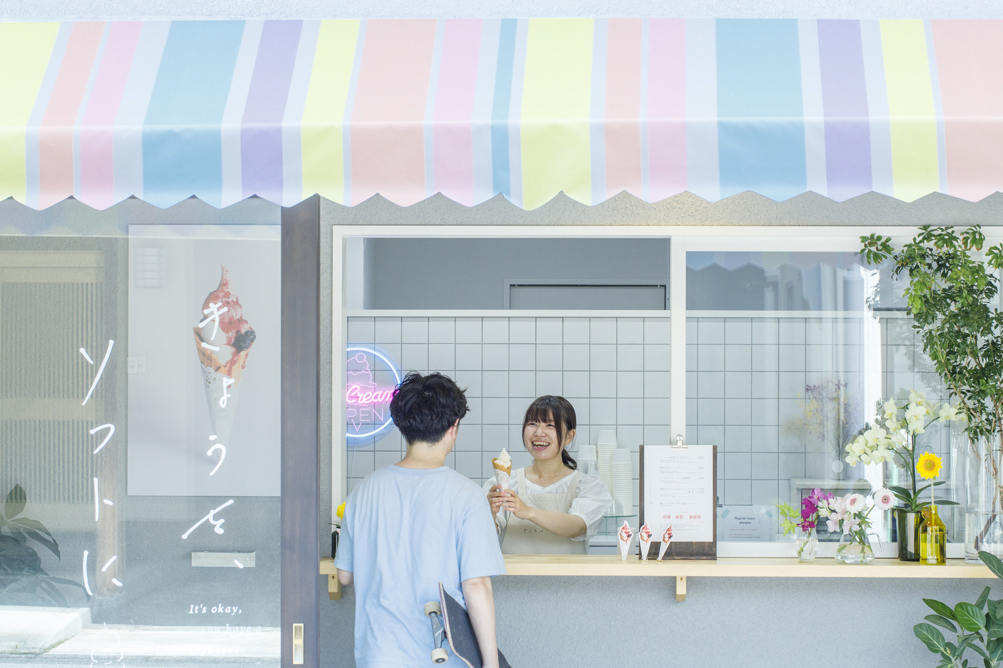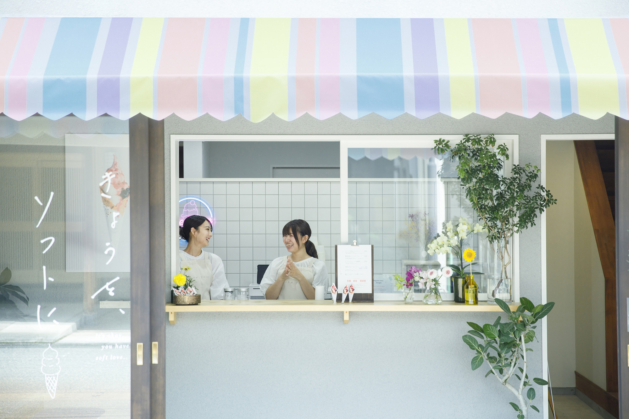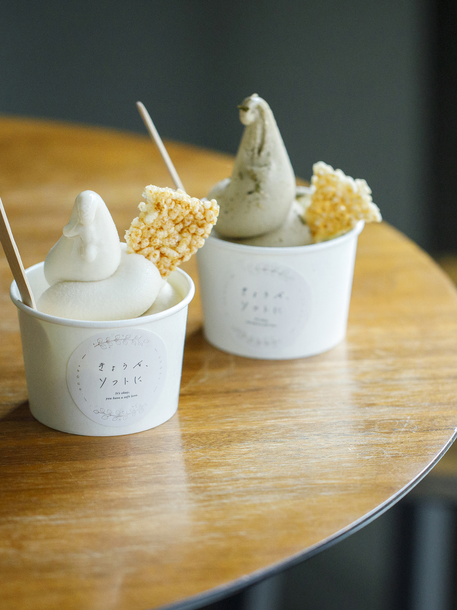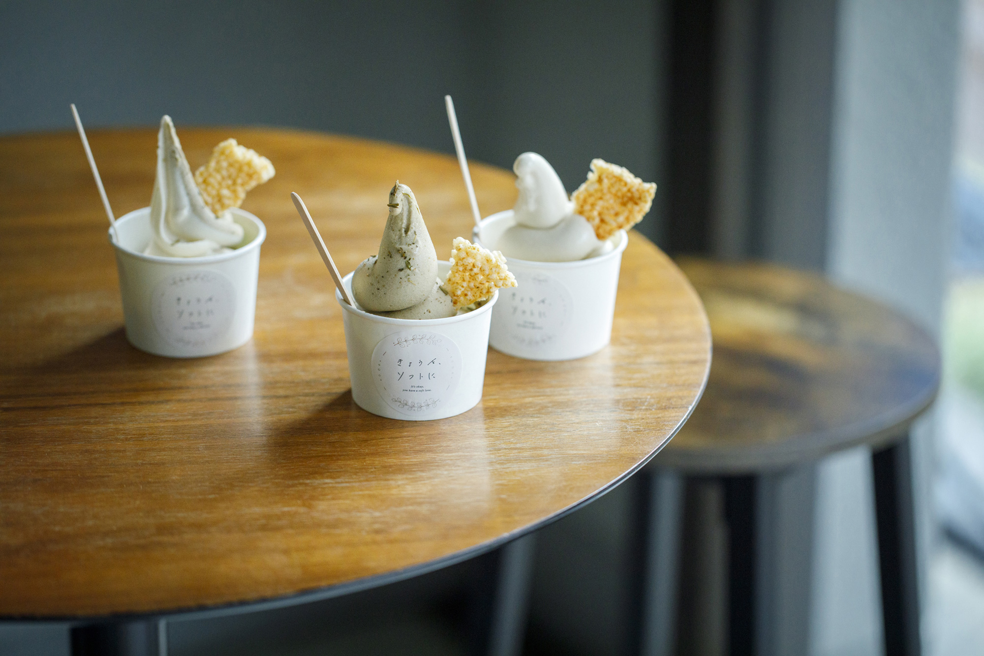 「きょうを、ソフトに」。石川県小松市にオープンした、ヴィーガンソフトクリームのお店。地元産の豆乳、米麹、アガベシロップなど、植物由来の材料でつくられたカラダに優しいソフトクリームを提供。来店者の毎日を「きょうを、ソフトに」することがミッション。
