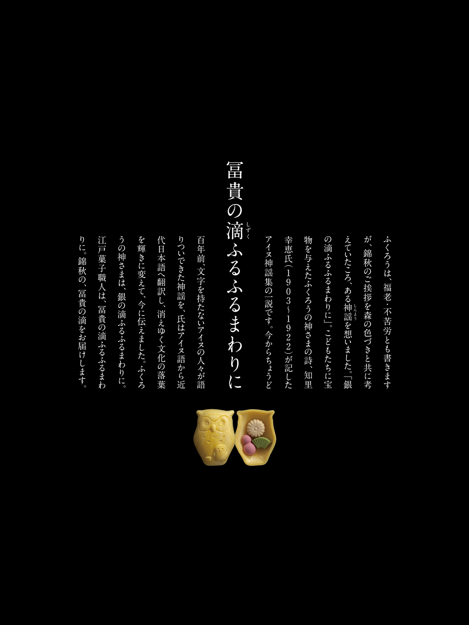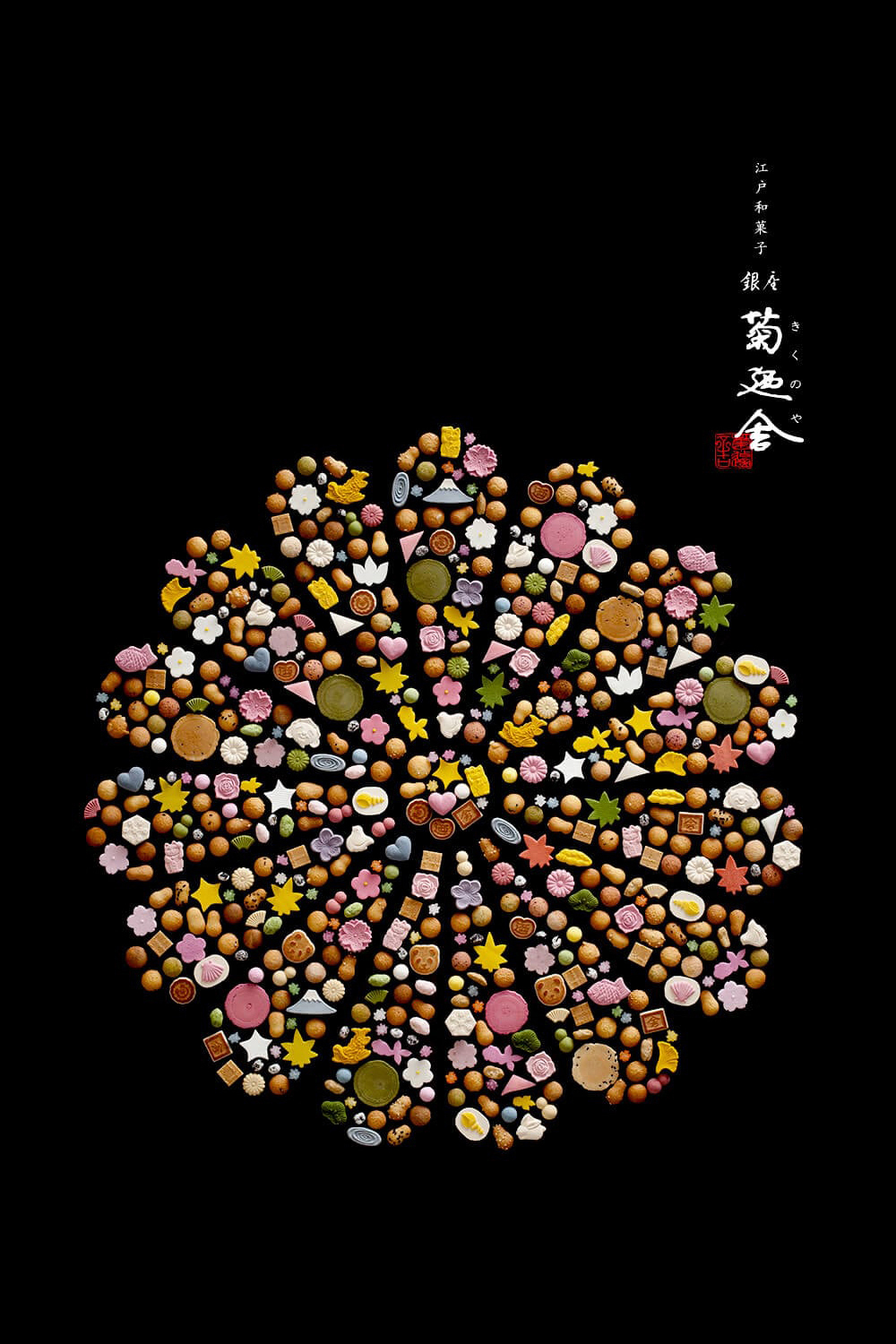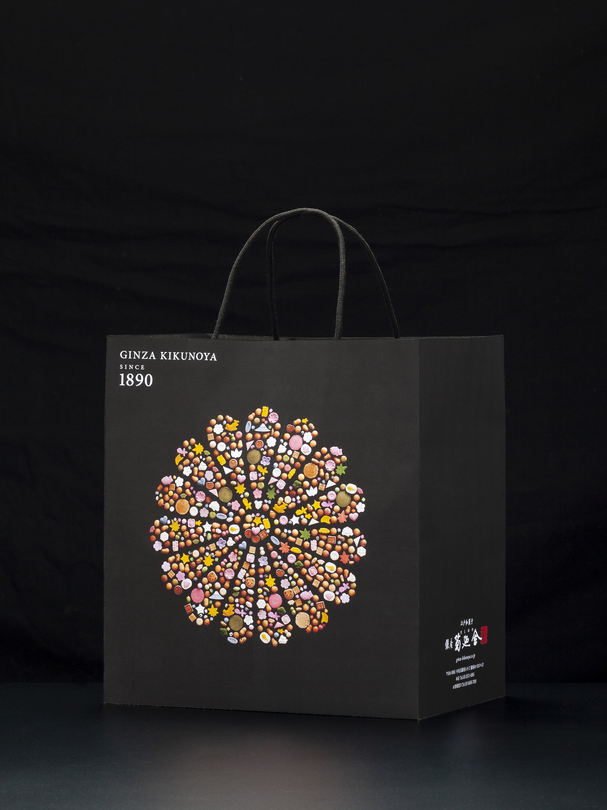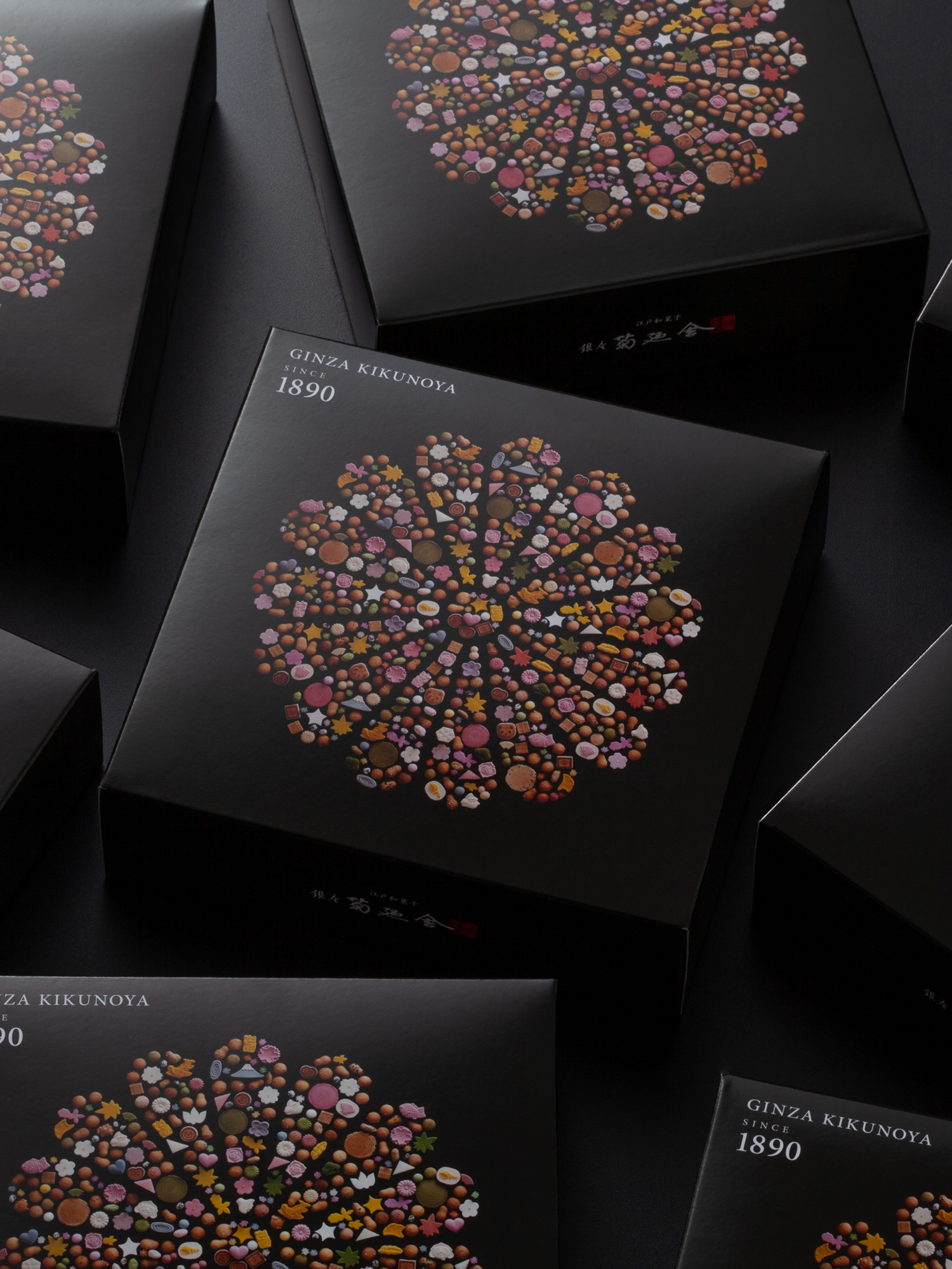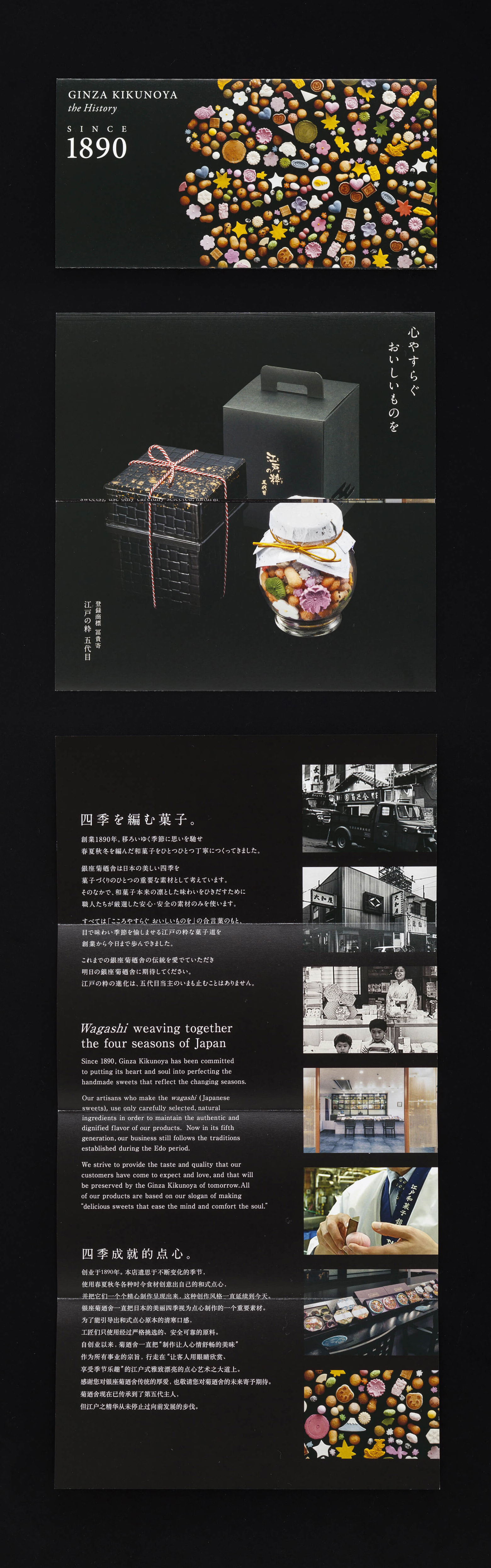 1890年創業の江戸和菓子の銘店「銀座 菊廼舎 -GINZA KIKUNOYA-」のブランドデザイン。キービジュアルは代表銘菓である冨貴寄を、十五紋菊のかたちに並べて表現。ブランドカタログ・クレド・名刺などのコーポレートツールに展開。歴史とこだわりを伝えるカタログは、英語・簡体語に対応し、世界に向けて魅力をアプローチ。