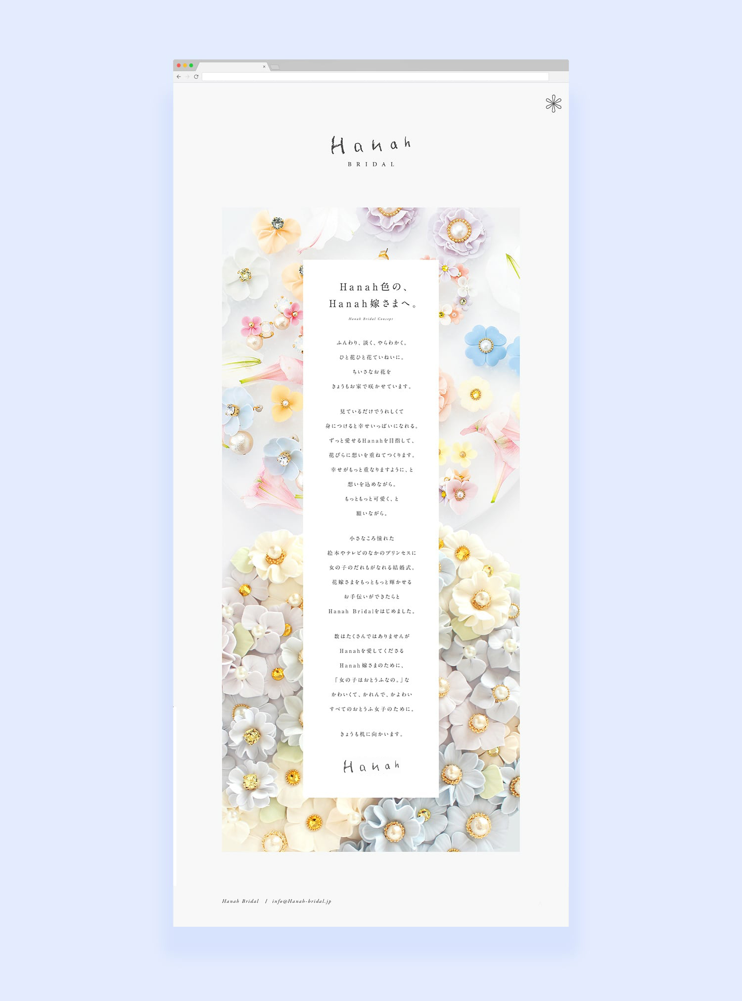 クレイフラワーデザイナー Hanah のブライダルラインブランドサイト。 「Hanah色の、Hanah嫁さまへ。」をコンセプトに、可憐さと小女性を大切にアプローチした。
