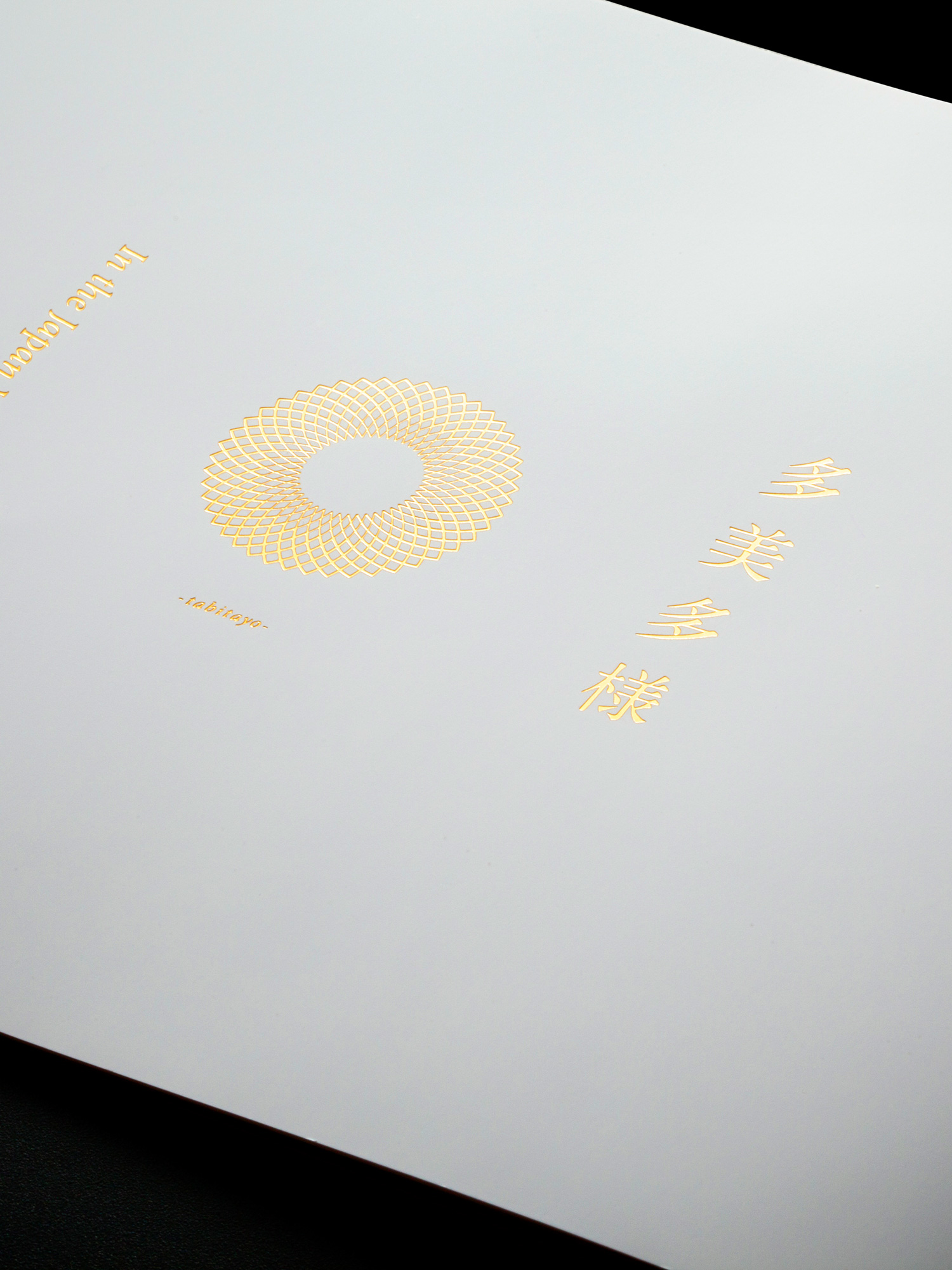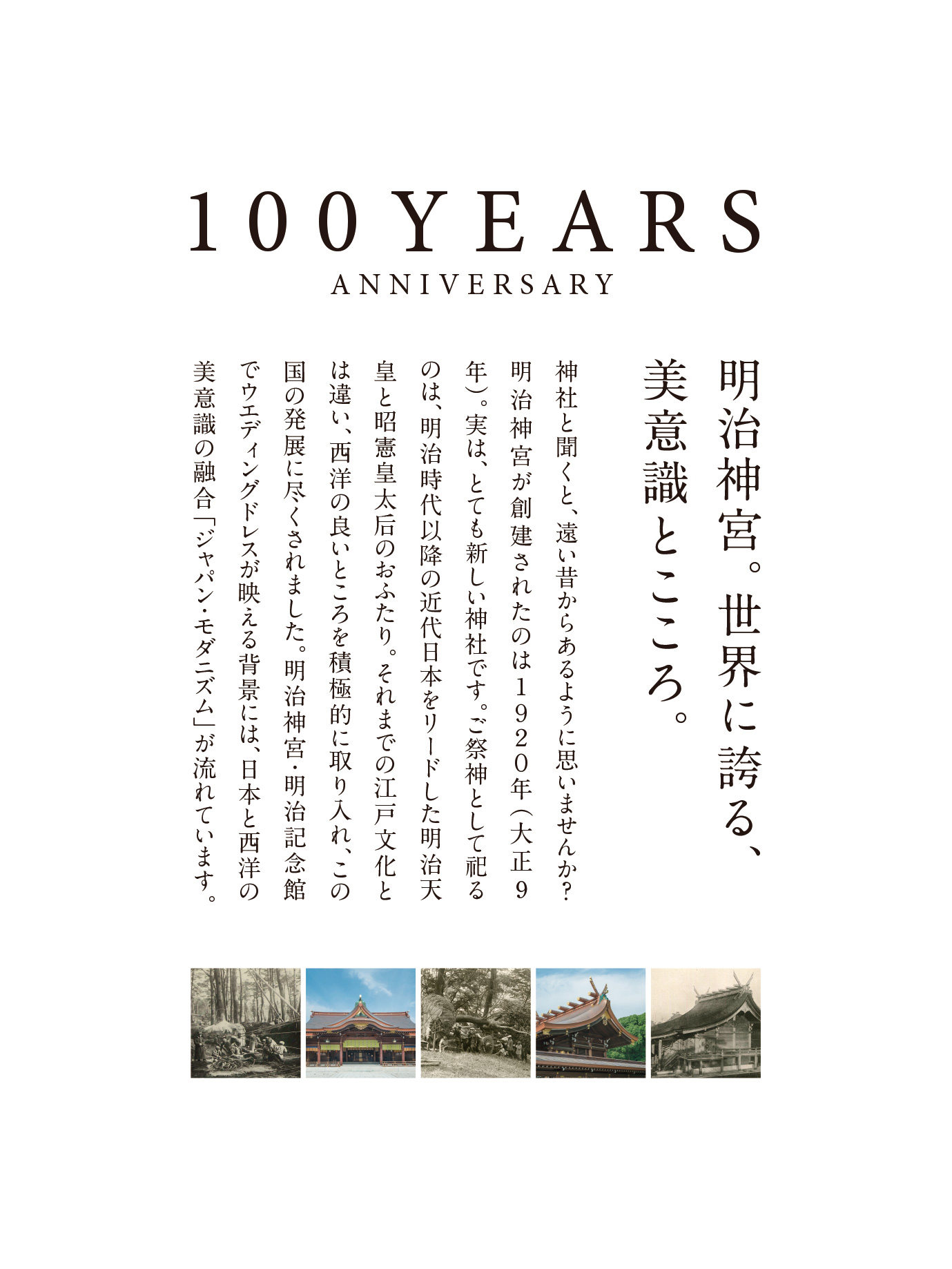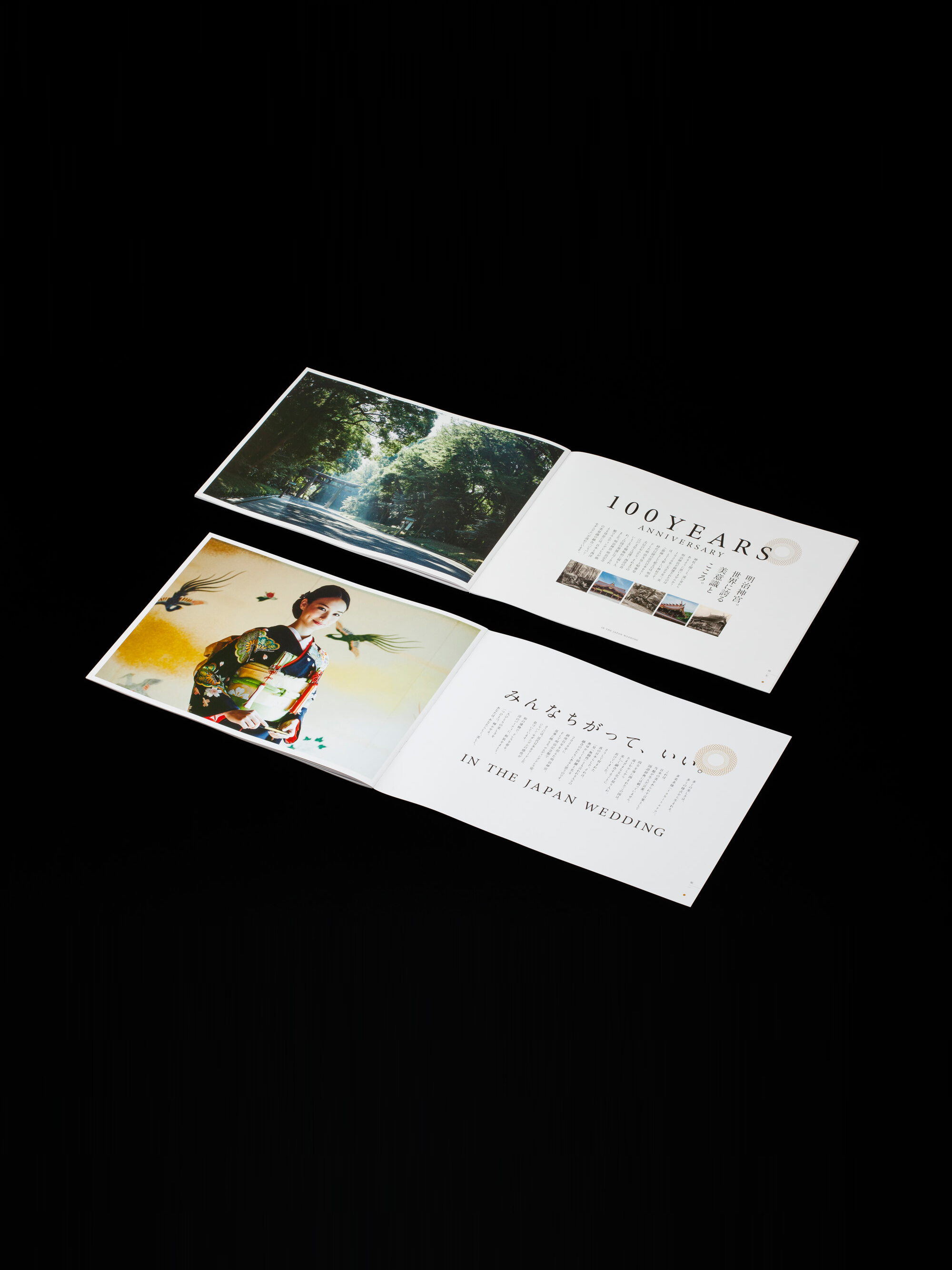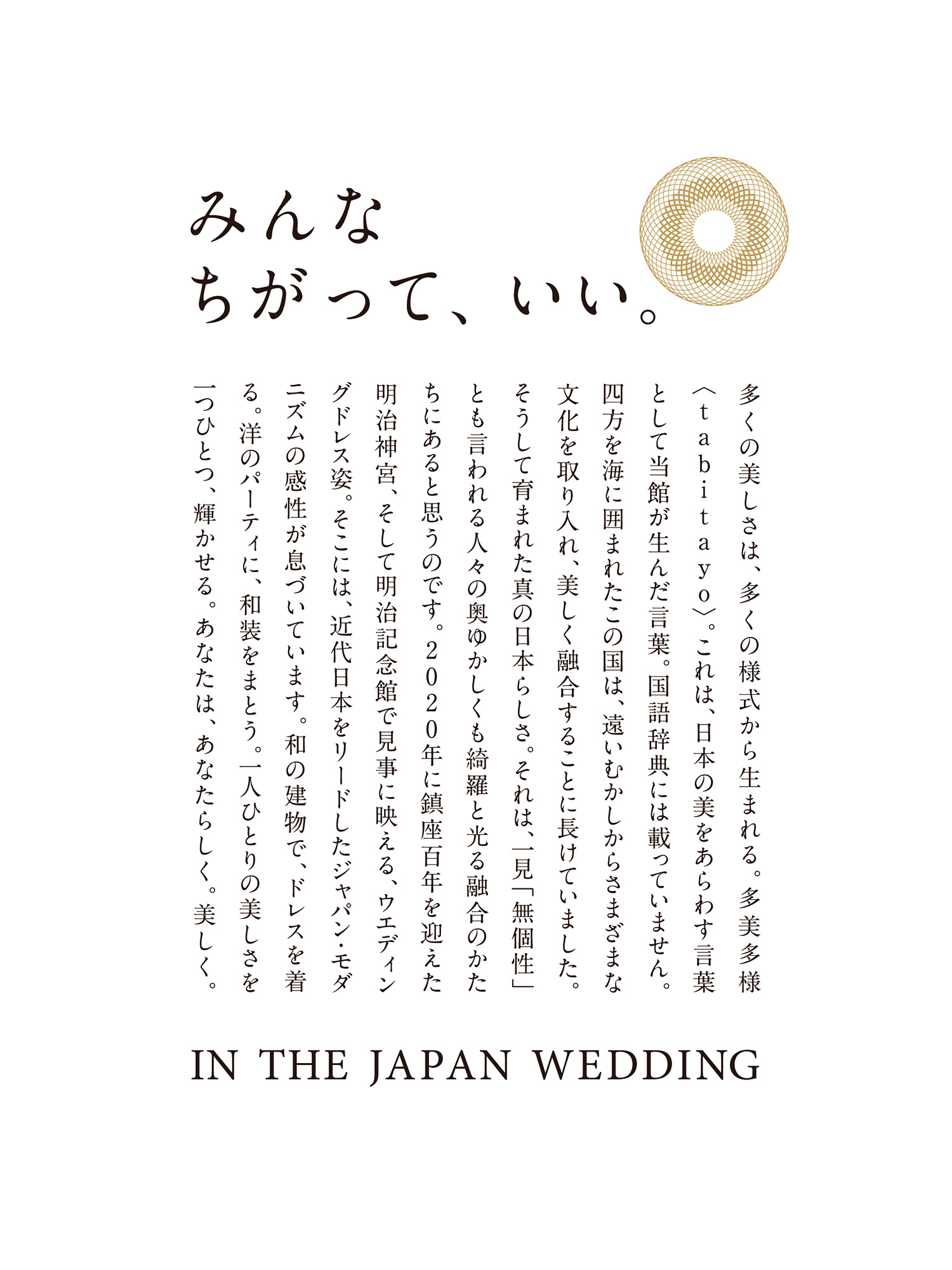 多くの美しさは、多くの様式から生まれる。多美多様 -tabitayo- をコンセプトに、明治神宮・明治記念館の100周年パンフレットを制作。鎮座から百年を迎えた明治神宮には、近代日本をリードしたジャパン・モダニズムの感性が息づいている。和の建物でドレスを着る。洋のパーティに和装を纏う。伝統と格式に多様性が融合する、日本の新たな婚礼をつくってゆく。クリエイティブディレクターは、(株)リクルートの隈本剛氏。